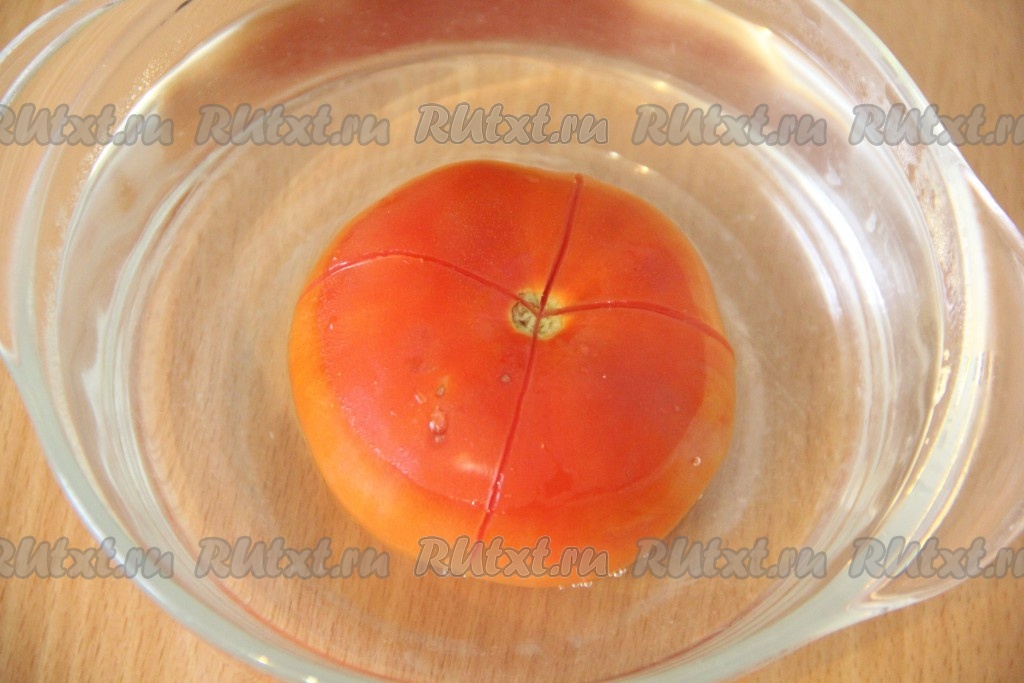 Помидоры вымыть, сделать на каждом помидоре крестообразный надрез. Положить помидоры в глубокую миску, залить крутым кипятком, оставить в воде на несколько минут, затем аккуратно снять кожицу.