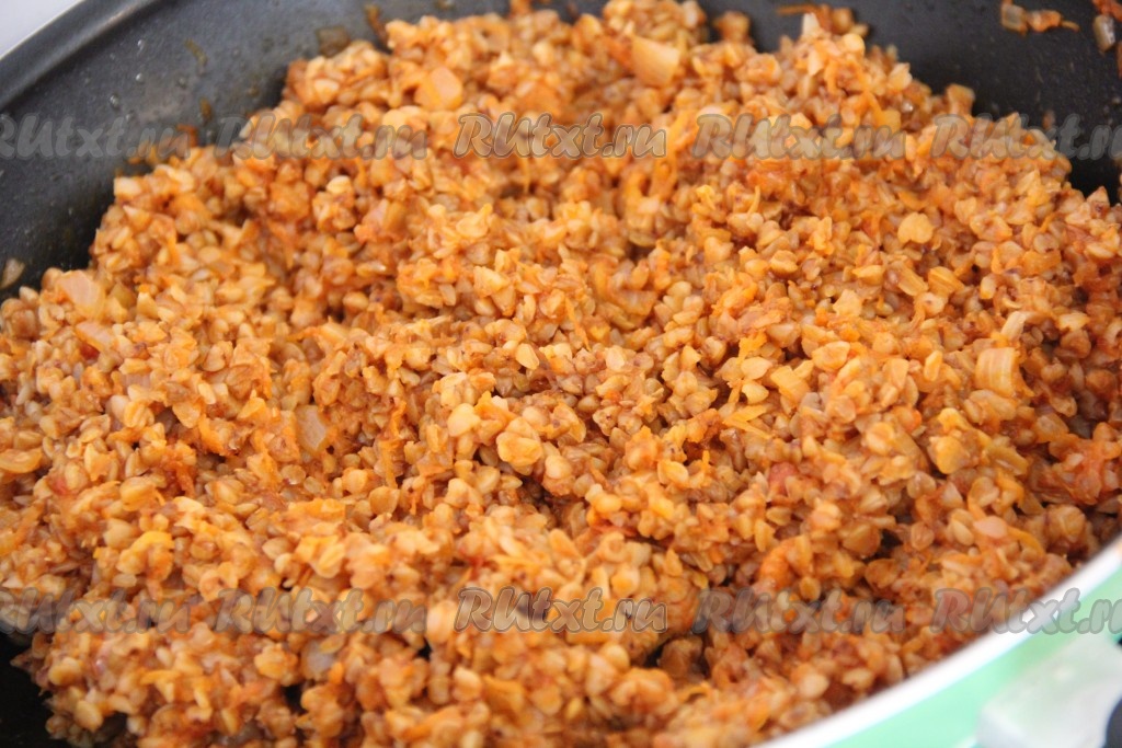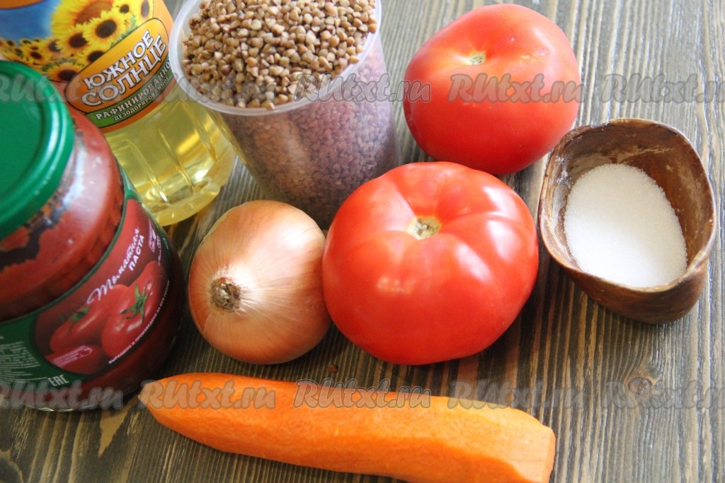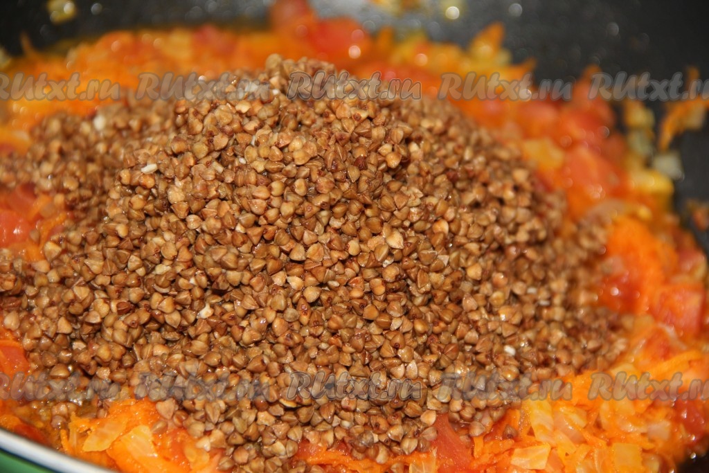 Гречку перебрать и хорошо промыть. Добавить гречку в сковороду к помидорам, луку и моркови.