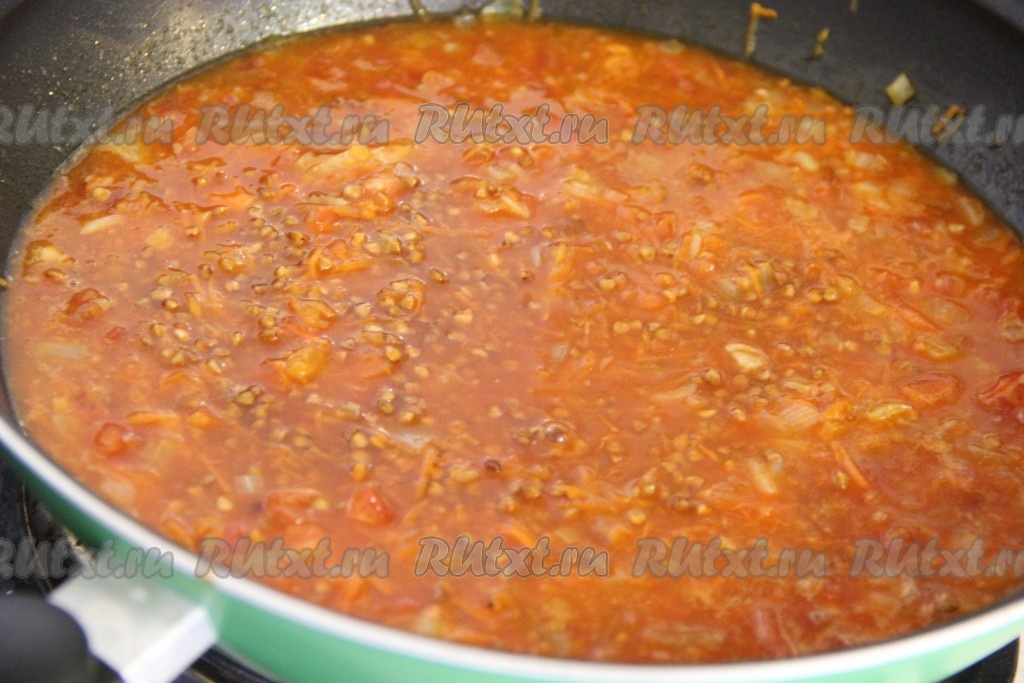Затем влить в сковороду томатную смесь. Всё хорошо перемешать и довести до кипения. Далее убавить огонь, накрыть сковороду крышкой и томить гречку с помидорами в течение 20-25 минут.