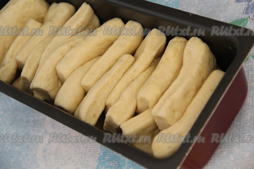 Затем выложить кусочки теста в форму не плотно, как на фото. Оставить форму с тестом в тепле на 20-30 минут.