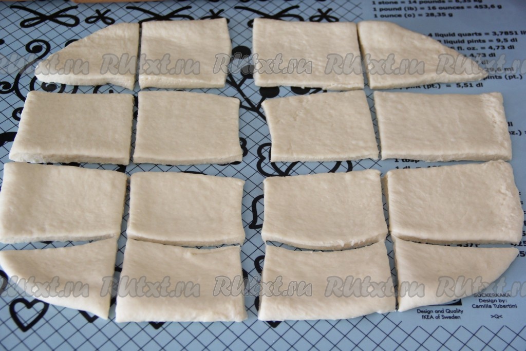 Нарезать тесто на прямоугольники, у меня получилось 16 штук.