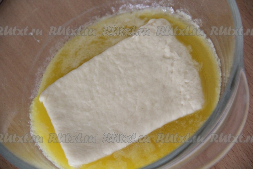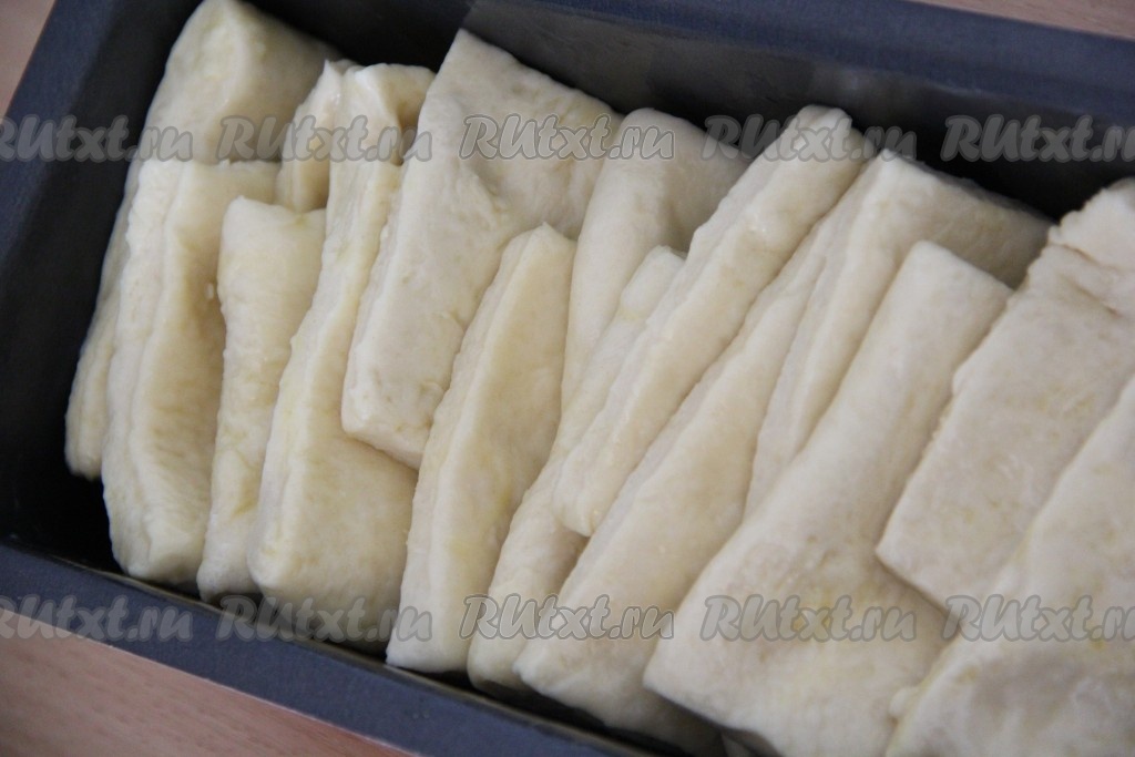 Форму для выпечки лучше взять прямоугольную с высокими бортиками. Я использовала металлическую форму для выпечки кексов и хлеба. Смазать форму сливочным маслом. Каждый кусочек теста обмакнуть со всех сторон в растопленное масло.