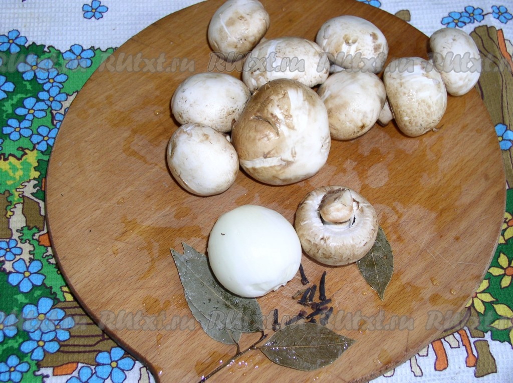 Шампиньоны помыть, обсушить и нарезать пластинками. Обжарить грибы со специями в разогретом масле до золотистого цвета (я в качестве специй добавляю 1 лавровый лист или 1-2 гвоздички, а в конце жарки их удаляю). Полученное масло слить в отдельную емкость.
