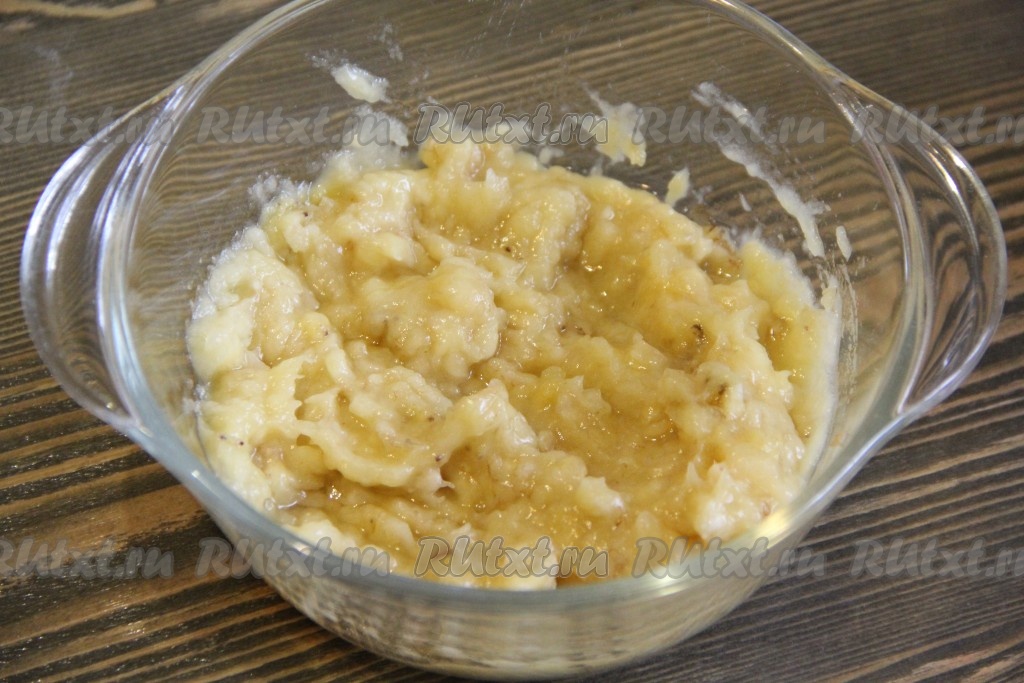 Бананы почистить и пюрировать с помощью вилки или погружного блендера. Бананы лучше взять переспелые. У меня таких не нашлось, поэтому я готовила из плотных бананов, но на вкус это никак не повлияло.