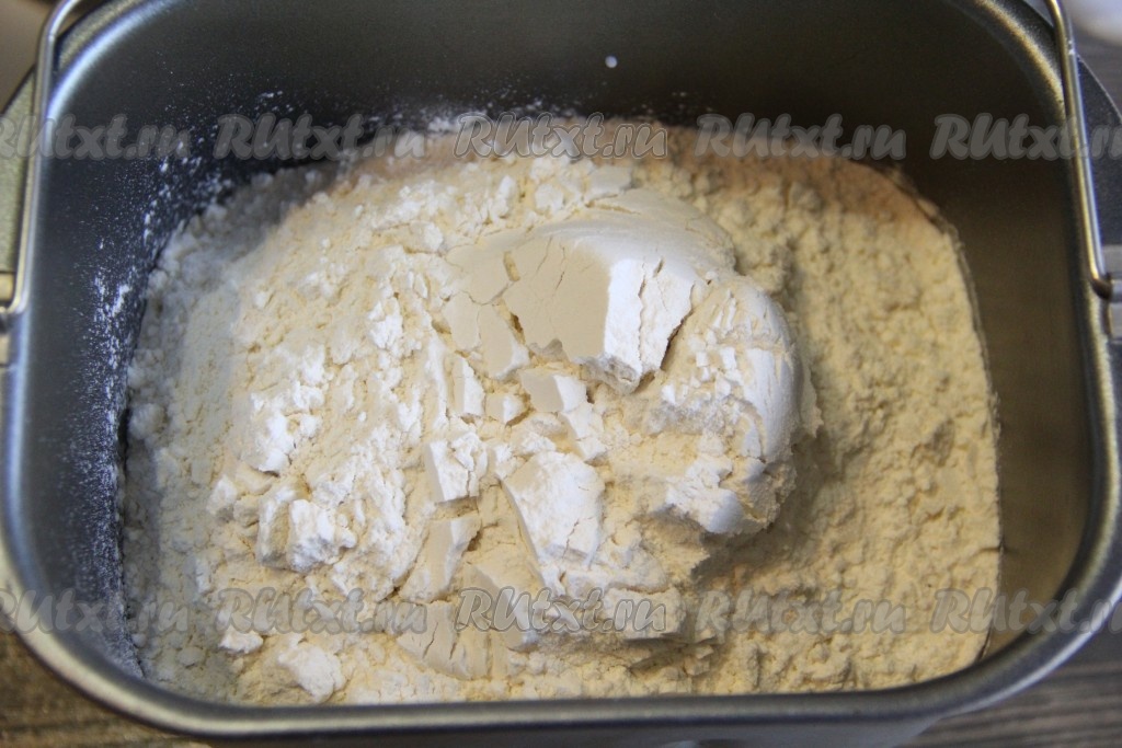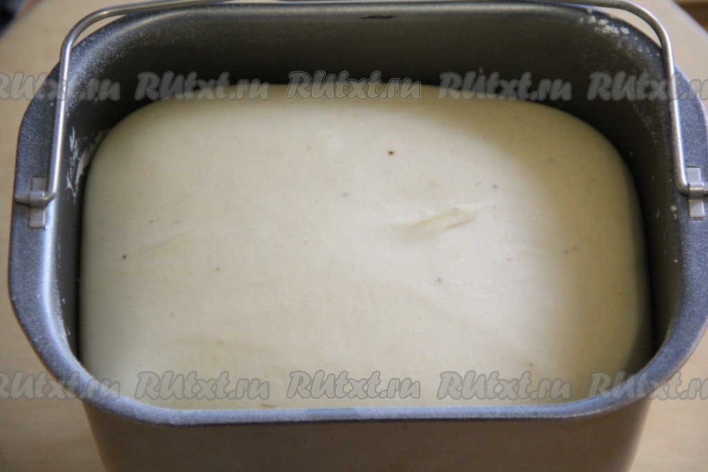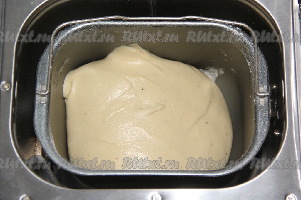 Далее всыпать муку. Выставить режим "Замес теста", у меня этот режим длится 1 час 30 минут.