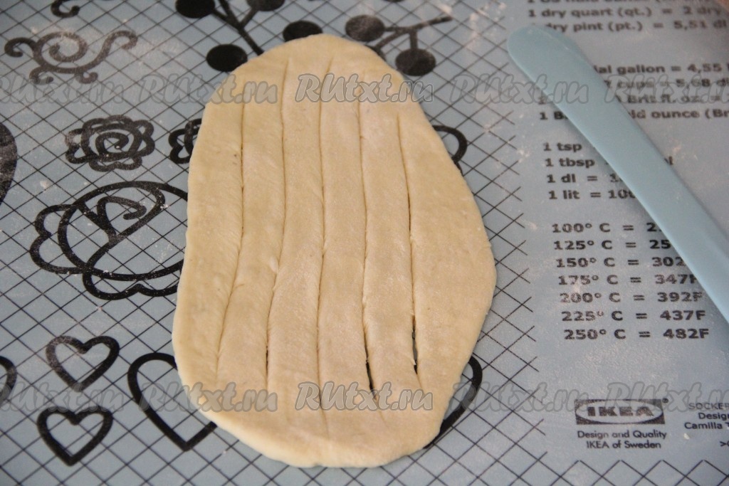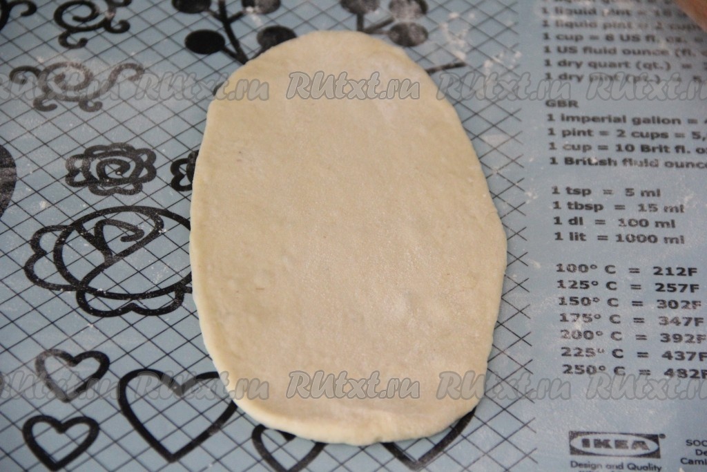 Раскатать каждый кусочек теста с помощью скалки в овал, не тонко.
