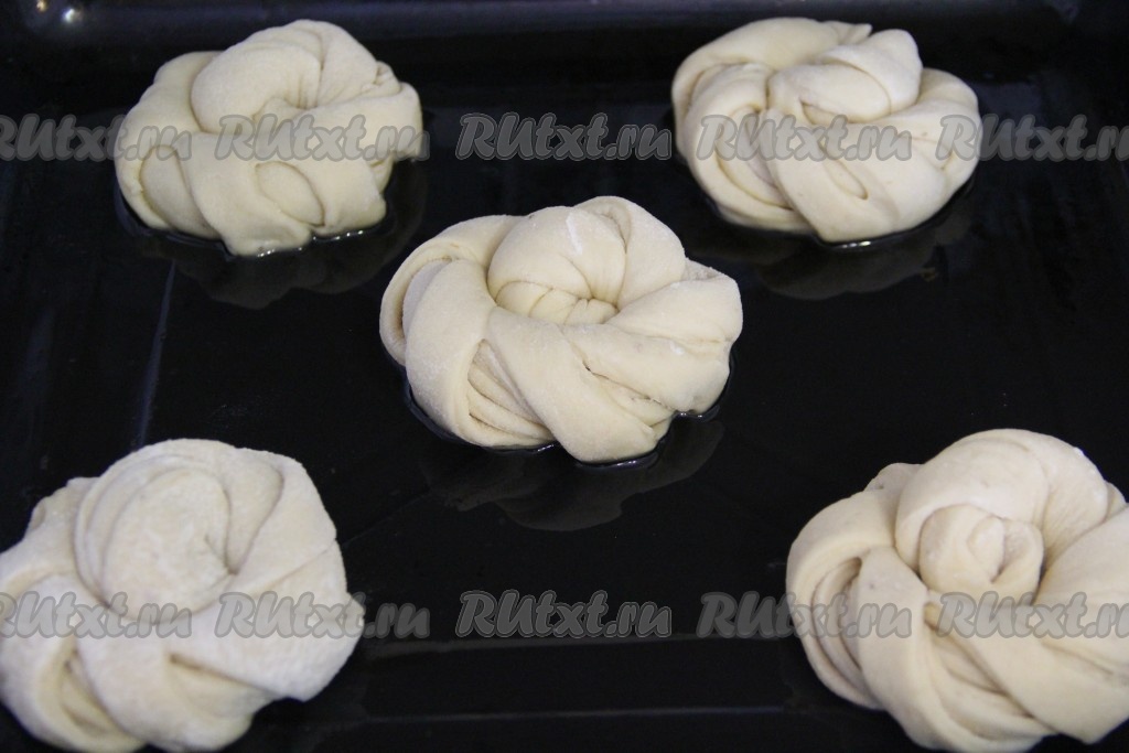 Противень для выпекания смазать растительным маслом. Выложить получившиеся булочки с бананом на противень (на некотором расстоянии друг от друга) и оставить их для расстойки на 30 минут в тёплом месте.