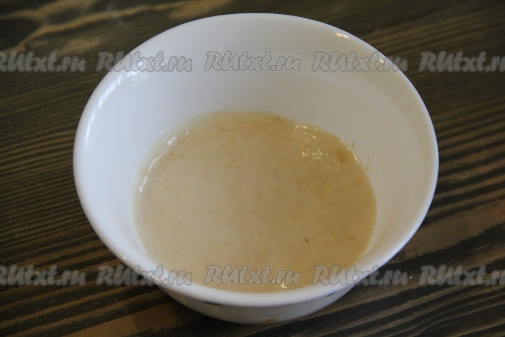 Дрожжи всыпать в 50 мл тёплой воды, размешать и оставить на 10-15 минут в теплом месте. На поверхности воды должна появиться пышная, пузырчатая шапочка.