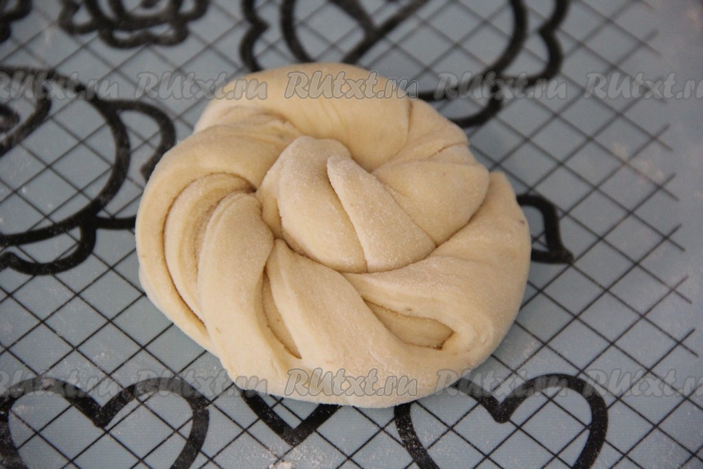 Слегка припорошить тесто мукой и свернуть с наклоном в жгутик. Сворачивать нужно не плотно.