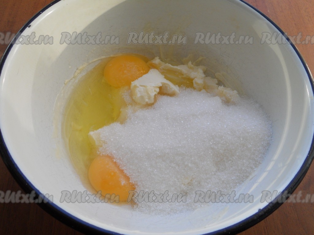 К размягченному маслу добавить яйца и сахар.