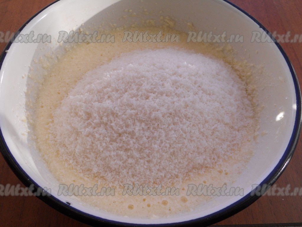 Хорошо взбить миксером до тех пор, пока масса не побелеет. Всыпать кокосовую стружку и влить молоко.