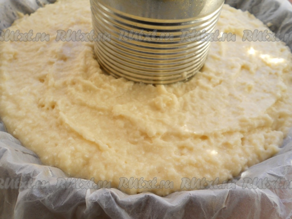 Все хорошо перемешать, тесто должно получиться довольно густым и липнущим. Застелить форму пергаментом, смазать сливочным маслом. Выложить тесто в форму, предварительно поместив по середине консервную банку, смазанную немного растительным или сливочным маслом так, чтобы при выпечке получился кекс-кольцо. Если есть специальная форма - используйте ее. Это нужно для того, чтобы кекс хорошо пропекся.