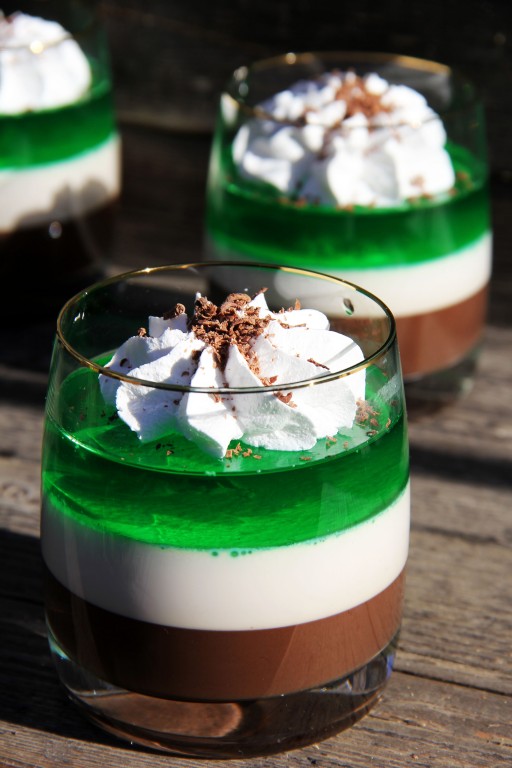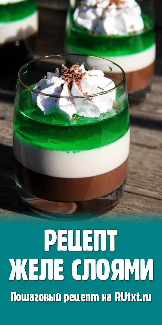 Для третьего слоя нужно развести упаковку готового желе в 200 мл горячей воды. Я решила сделать зелёную полоску, а можно взять красное или жёлтое желе. В любом случае будет красиво!