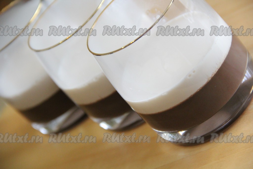 Смесь слегка остудить, а затем аккуратно разлить по стаканам на застывший первый слой желе. Таким образом у нас получилась вторая полосочка. Поставить стаканы с десертом в холодильник на пару часов до полного застывания второго слоя.