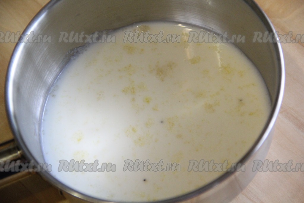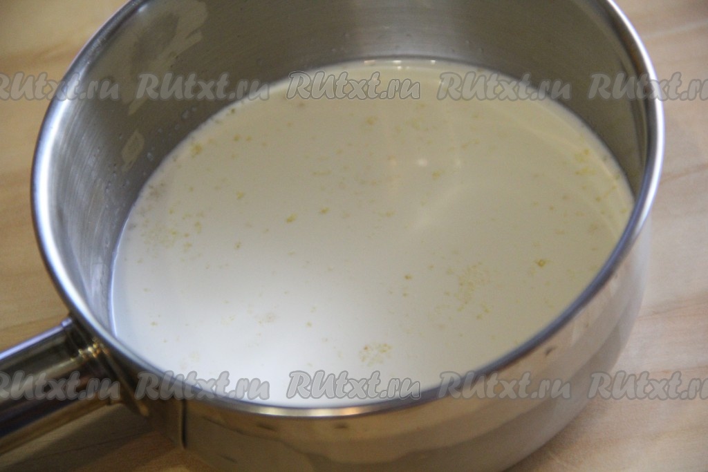 Когда желатин набухнет, добавить к сливкам 1 столовую ложку сахарной пудры. Поставить кастрюльку на средний огонь и прогреть смесь, помешивая, до полного растворения желатина, но не кипятить!