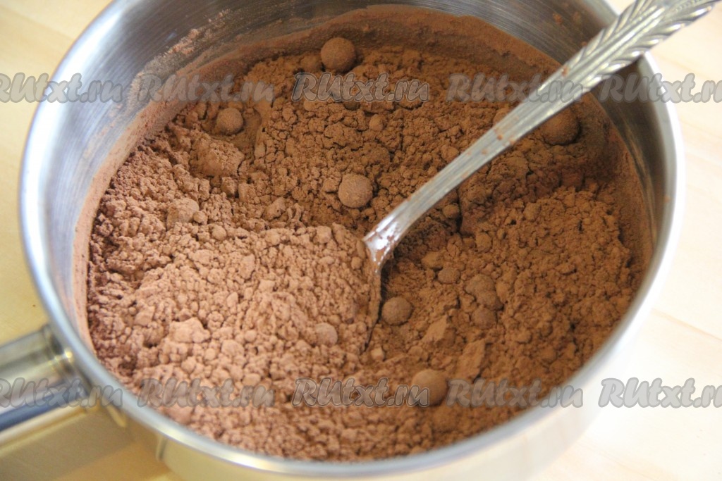 Затем добавить к молоку 1 столовую ложку сахарной пудры и какао. Всё перемешать и поставить на огонь. На среднем огне хорошо прогреть, помешивая, смесь до полного растворения какао и желатина, но не кипятить!