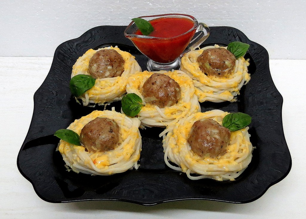 Аппетитные фрикадельки я подала со спагетти, придав макаронным изделиям форму гнёзд. Горячие гнёзда из спагетти я присыпала сыром, натёртым на мелкой тёрке. В качестве дополнения к фрикаделькам можно подать различные соусы (например, томатный). Отличное повседневное блюдо, попробуйте!