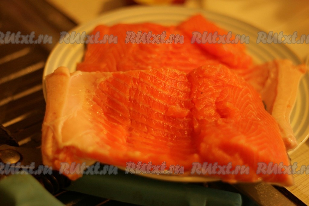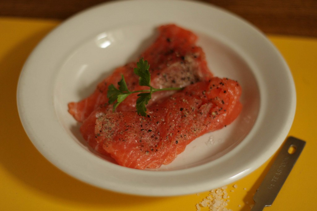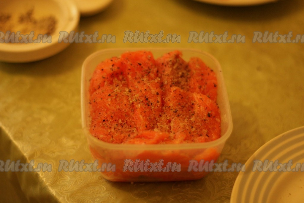 Выложить второй слой сёмги и так же, как предыдущий посыпать смесью перцев и солью. Таким же образом уложить и все остальные слои для засолки. Последний слой рыбы более обильно присыпать солью.