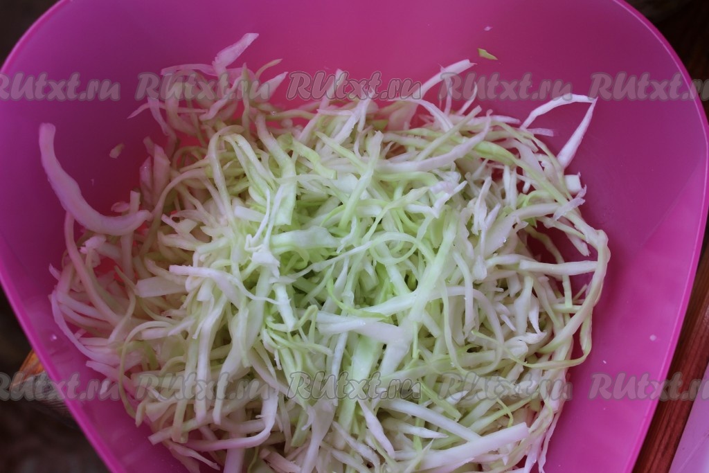 Как можно тоньше нашинковать капусту, затем посолить её, поперчить и слегка помять руками.