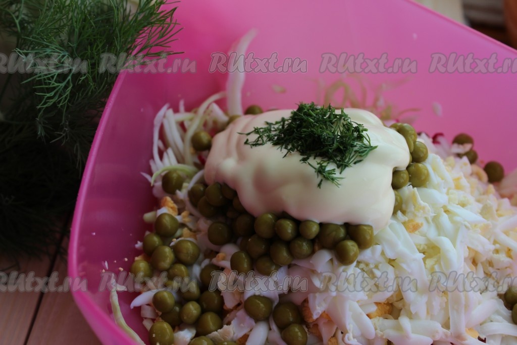 Салат с капустой, редисом, яйцами и горошком заправить сметаной или майонезом, добавить нарезанную зелень и перемешать.