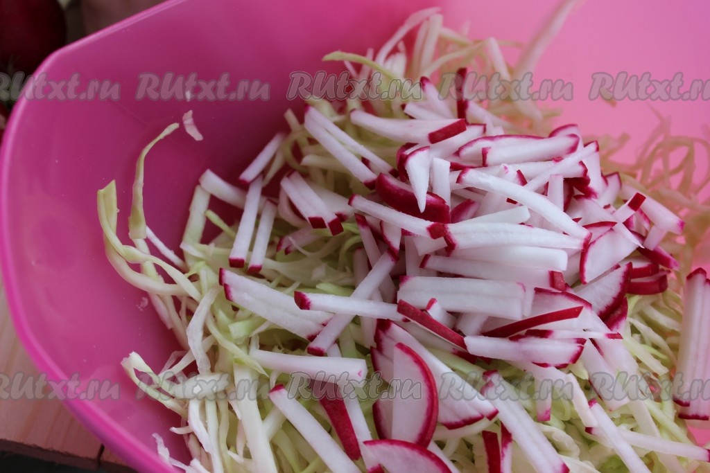 Редис хорошо промыть, удалив листья и корешки, нарезать тонкими полосками и добавить в салат к капусте.
