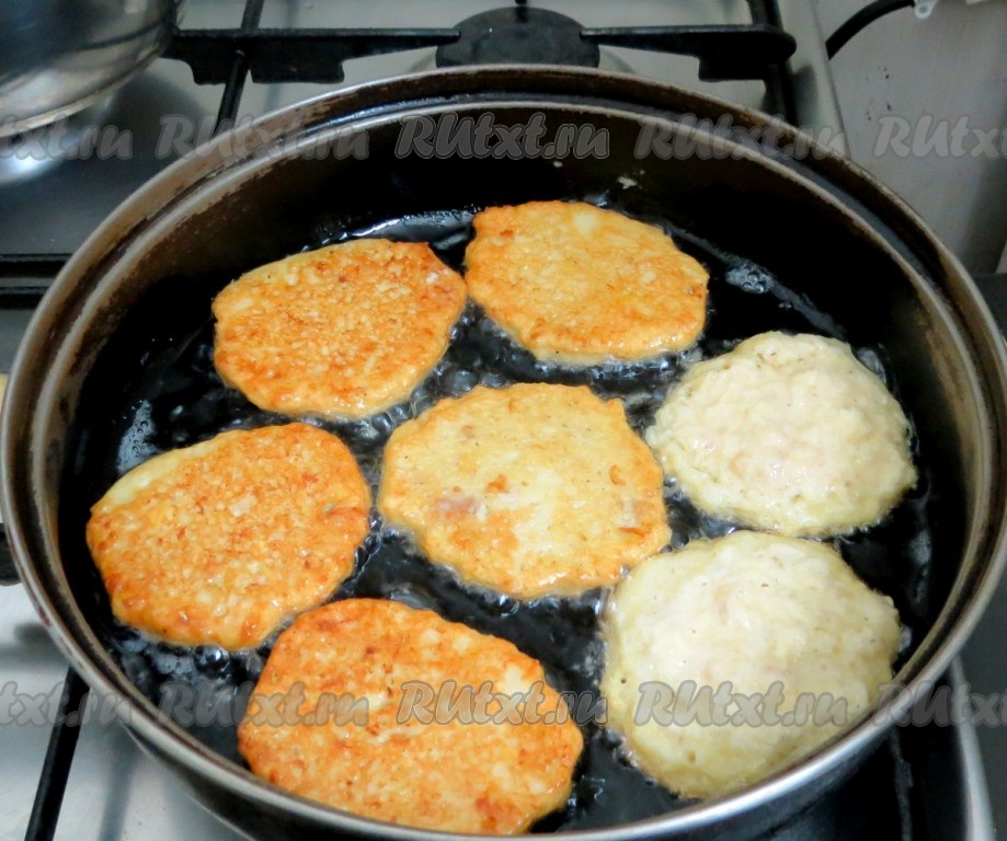Разогреваем на сковороде растительное масло и столовой ложкой выкладываем картофельную массу. Если вы хотите, чтобы драники были красивой формы, выливайте картофельное тесто в центр оладушка и масса равномерно будет растекаться во все стороны. Жарим картофельные драники с мясом с двух сторон на среднем огне до золотистой корочки (примерно по 2 минуты с каждой стороны). Время жарки зависит от толщины оладий, от сковороды и нагрева.