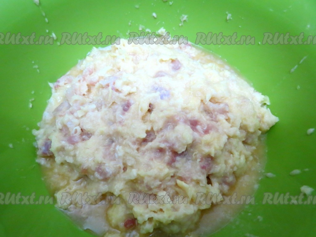 Я картошку натирала в электрической мясорубке с помощью специально предназначенного для этого диска. Вместе с картофелем я пропустила через мясорубку мясо и лук, заранее нарезав их на части. Если готовить вручную, то картошку и лук натереть на тёрке (лучше мелкой). Мясо прокрутить на мясорубке с крупными отверстиями, но лучше очень мелко нарезать ножом, тогда в готовых драниках ощущаются кусочки мяса, делая блюдо особенно вкусным.