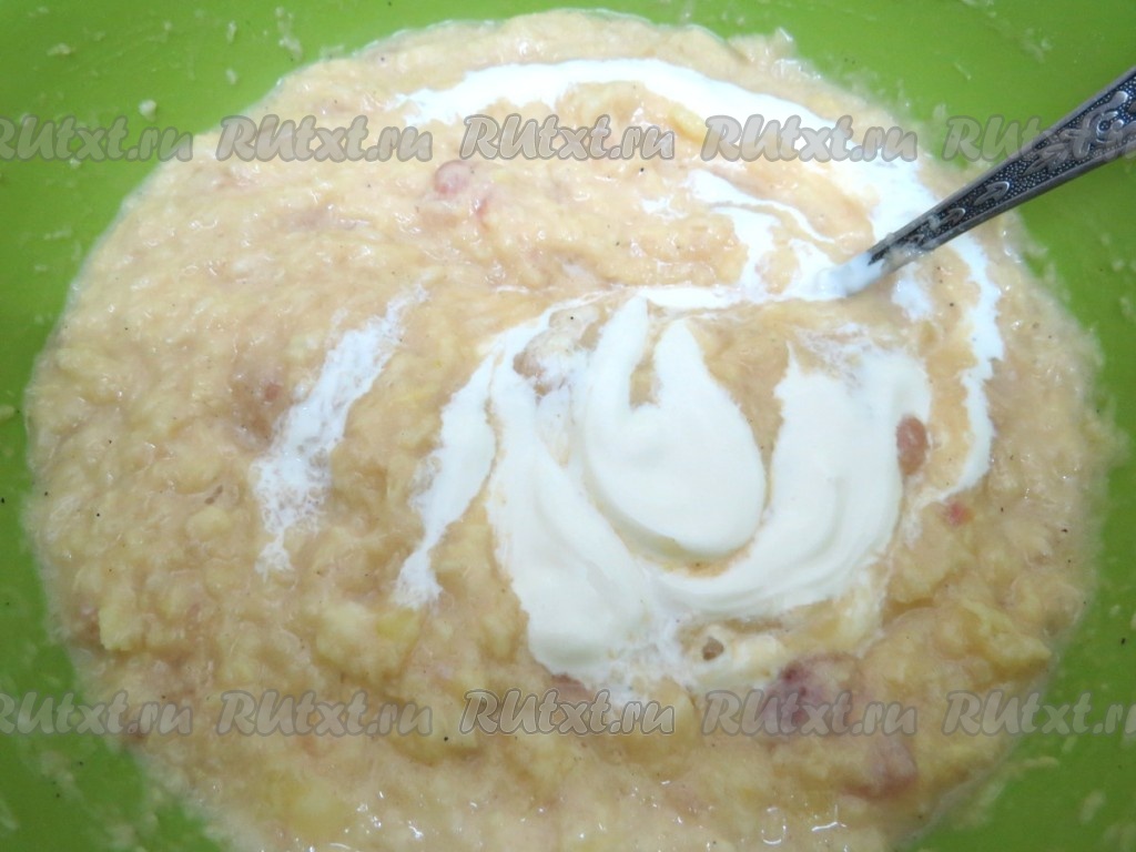 Солим, перчим, добавляем сметану, яйца и тщательно перемешиваем. Сметану мы добавляем, чтобы картофельная масса не темнела. Консистенция теста получится, как густая сметана.