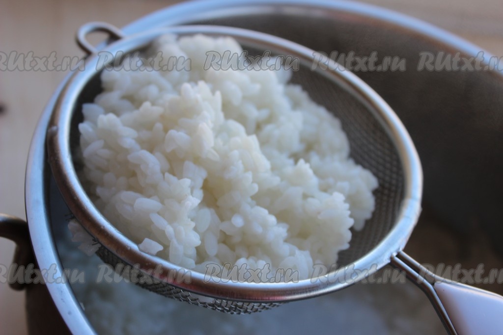 Откинуть рис на сито, дать лишней воде стечь.