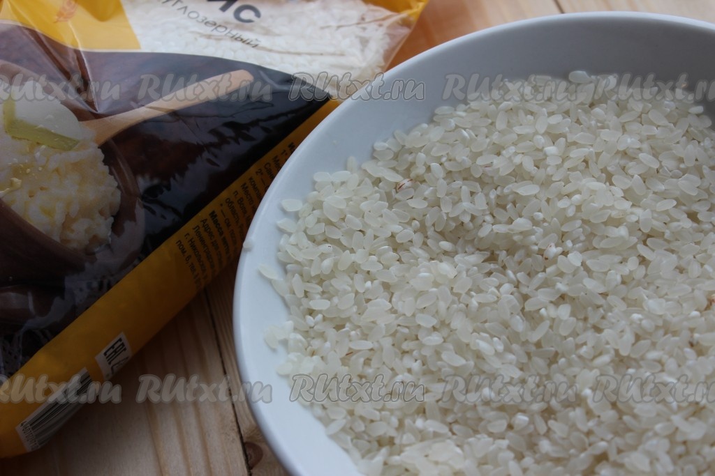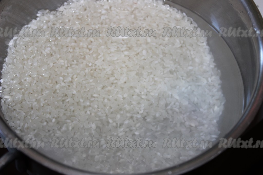 Круглозерный рис промыть несколько раз под проточной водой (пока вода не станет чистой и прозрачной).