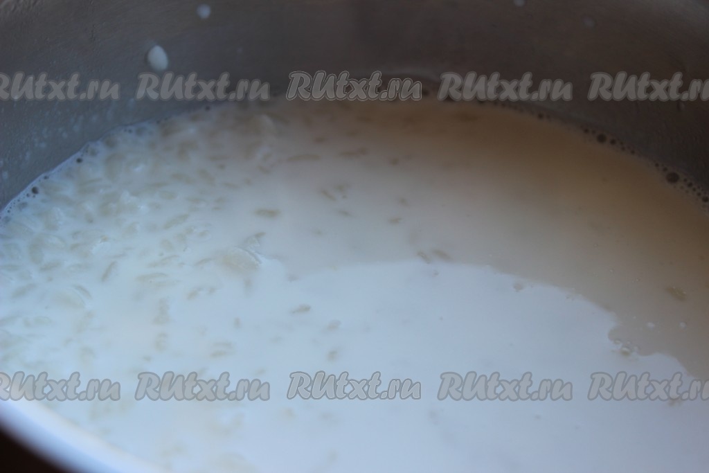 В другую кастрюлю влить молоко и дать ему закипеть. Всыпать рис в молоко, тщательно размешать. Варить рисовую кашу на медленном огне в течение 15-20 минут, не забывая часто помешивать.