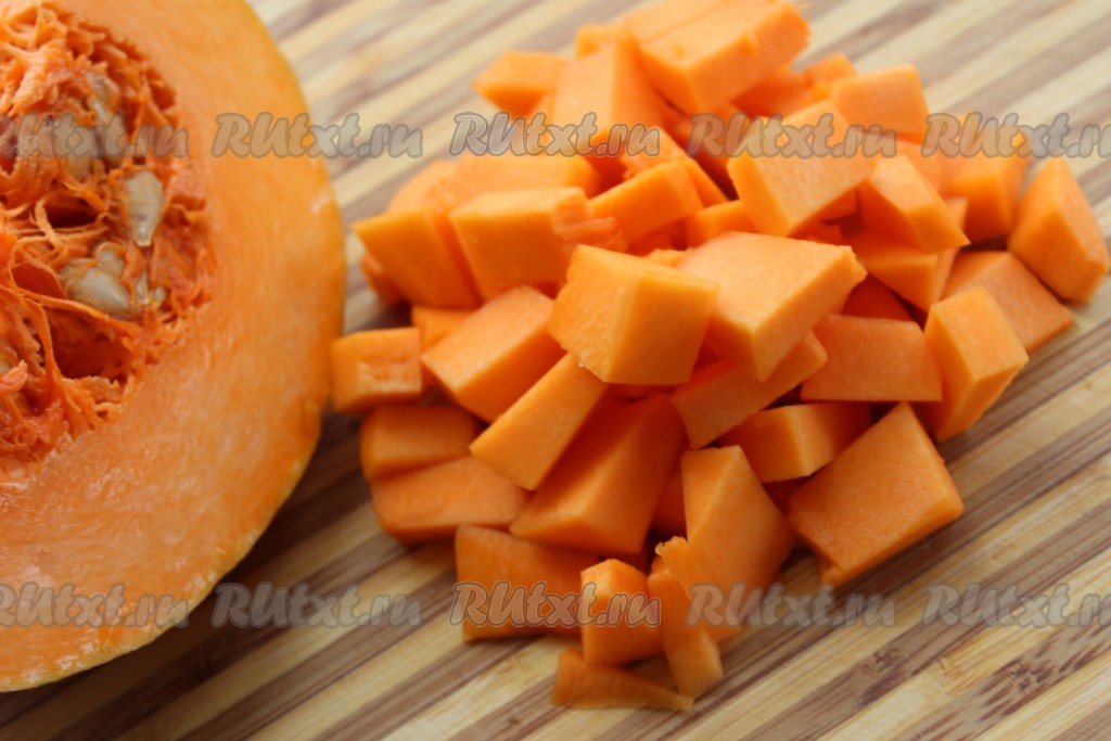 Тыкву очистить от кожуры, удалить семена. Мякоть тыквы нарезать небольшими кубиками.