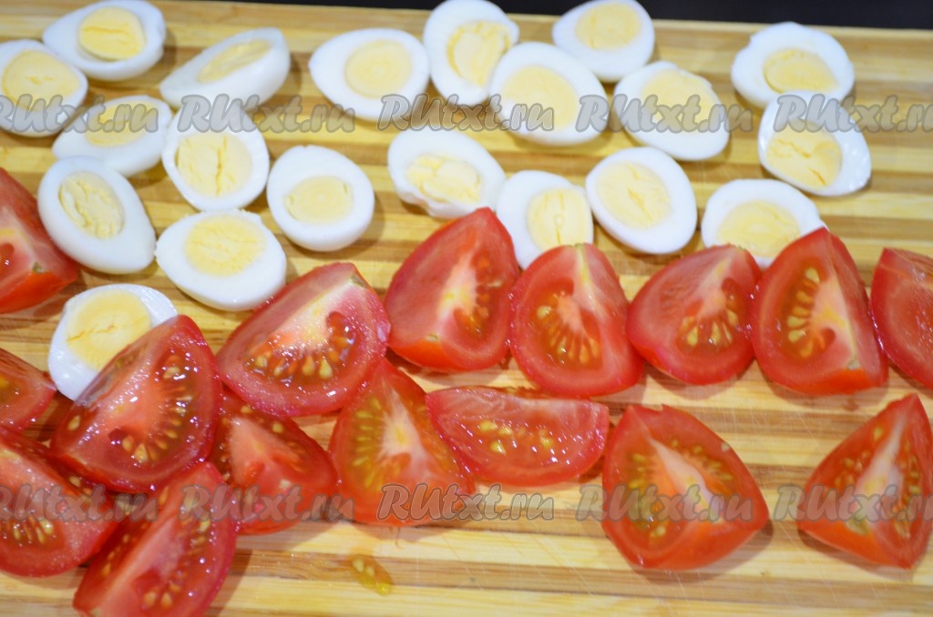 Сварить вкрутую перепелиные яйца (после закипания варить 5 минут), остудить, очистить, нарезать половинками (если будете готовить с куриными яйцами, то их надо варить 7 минут с момента закипания, а нарезать на 4 части). Помидоры черри нарезать также пополам (у меня крупноватые, я разрезала на 4 части).