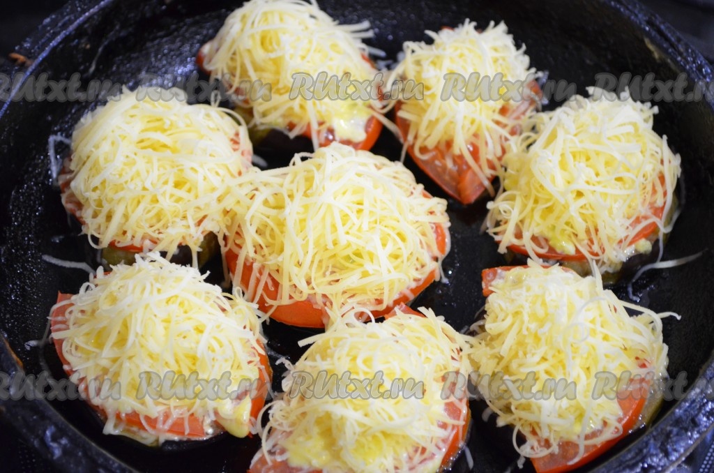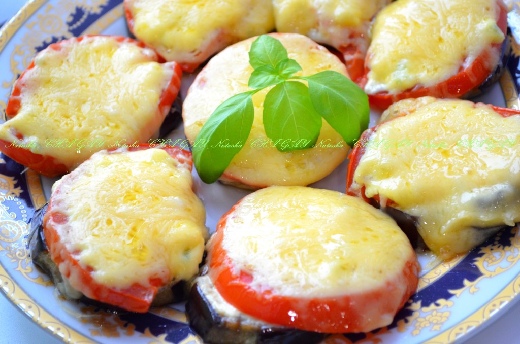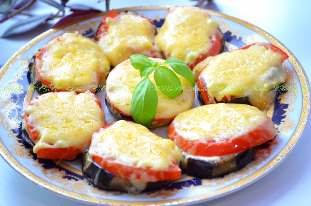 Отправить запекаться в духовку, разогретую до 200 градусов, минут на 15. Потом духовку выключить, каждый кружочек баклажана с помидором посыпать сыром, убрать в выключенную духовку, чтобы сыр расплавился.