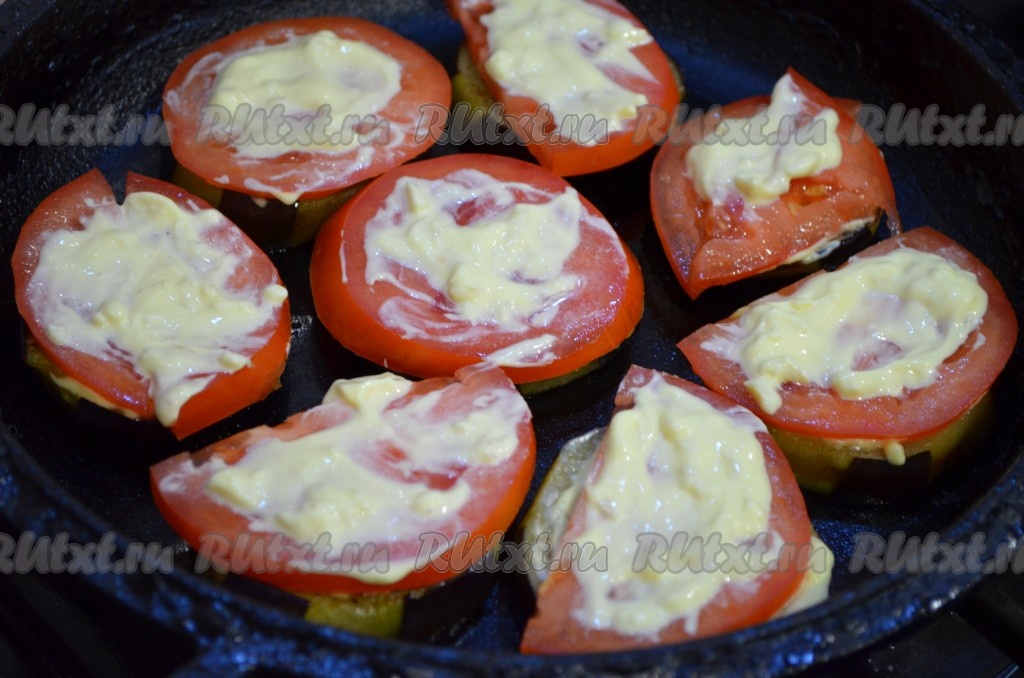 Помидор нарезать на не очень тонкие кружочки. На смазанные кружочки баклажанов выложить кружочки помидоров, тоже смазать смесью майонеза и чеснока.