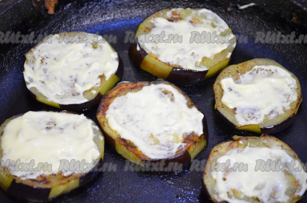Фому для запекания смазать растительным маслом. Обжаренные кружочки баклажана выложить в форму для запекания, слегка смазать их смесью майонеза с чесноком.
