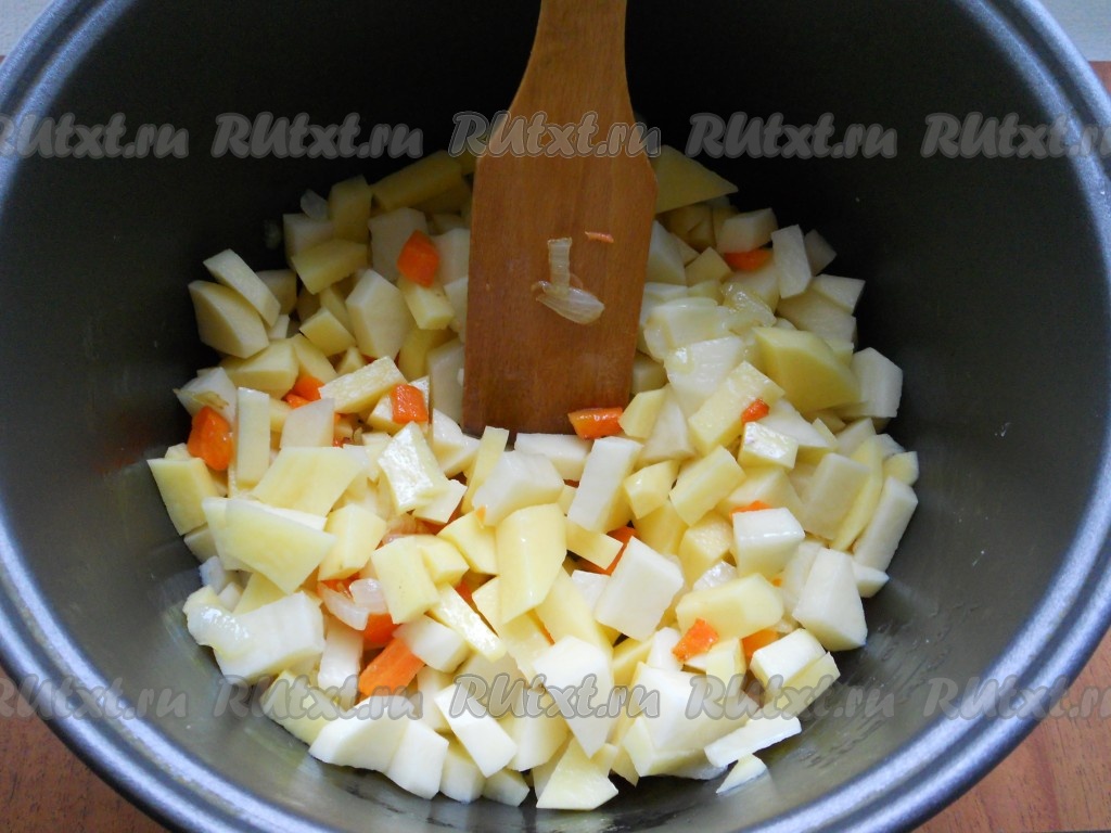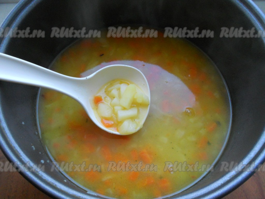 Выставить режим "Суп" на 1 час 10 минут. Через 50 минут открыть крышку мультиварки и в миску отложить 5-6 ложек картофеля (ложка мультиварочная), помять его вилкой или толкушкой. Затем вернуть обратно в суп. Перемешать.
