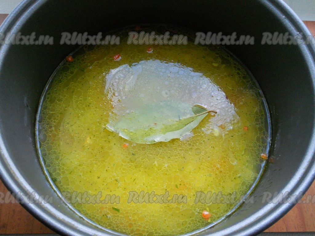 Влить горячий куриный бульон, всыпать специи, соль, паприку, добавить лавровый лист.
