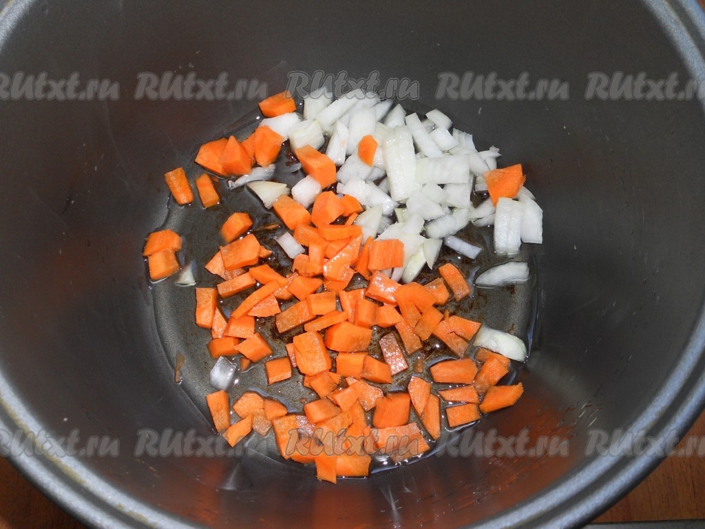 В чашу мультиварки влить растительное масло. Поместить в чашу нарезанные кубиками репчатый лук и морковь. Выставить режим "Жарка" на 10 минут (крышку можно не открывать).