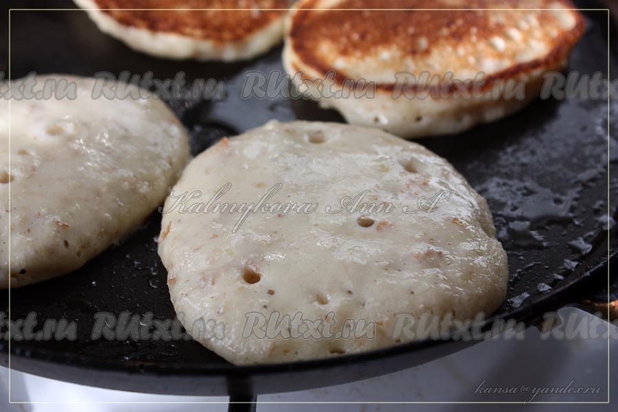 Жарить манно-злаковые оладьи на разогретой сковороде на растительном масле с двух сторон (требуется терпение, оладьи нежные, переворачивайте очень аккуратно).