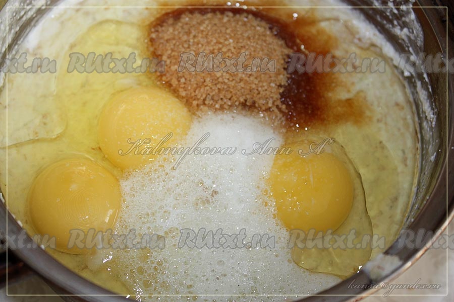 Добавить яйца, сахар, соль и гашеную лимонным соком соду. Влить растительное масло и хорошо перемешать тесто.