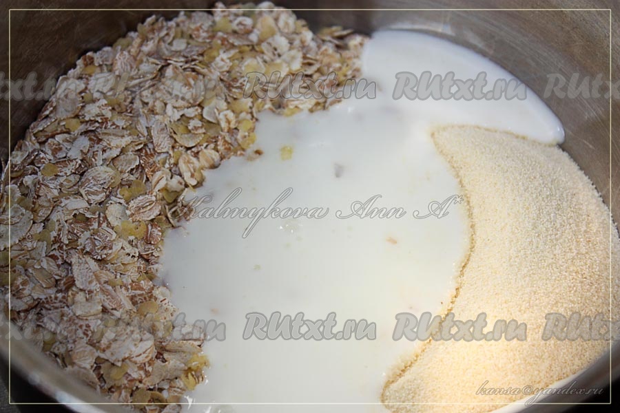 Смешать хлопья 5 злаков и манную крупу, добавить кефир, хорошо перемешать и оставить на 1-2 часа для набухания.
