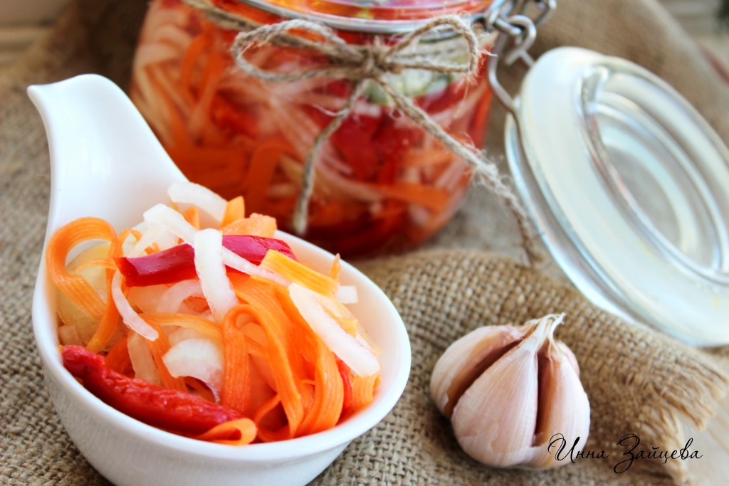 Через сутки ароматный, аппетитный болгарский перец, маринованный с луком и морковью, будет готов, его можно подать в качестве закуски и к мясу, и к птице, и к различным гарнирам. Хранить его в холодильнике можно не более двух недель. Закуска получается наивкуснейшей, а готовится очень быстро!