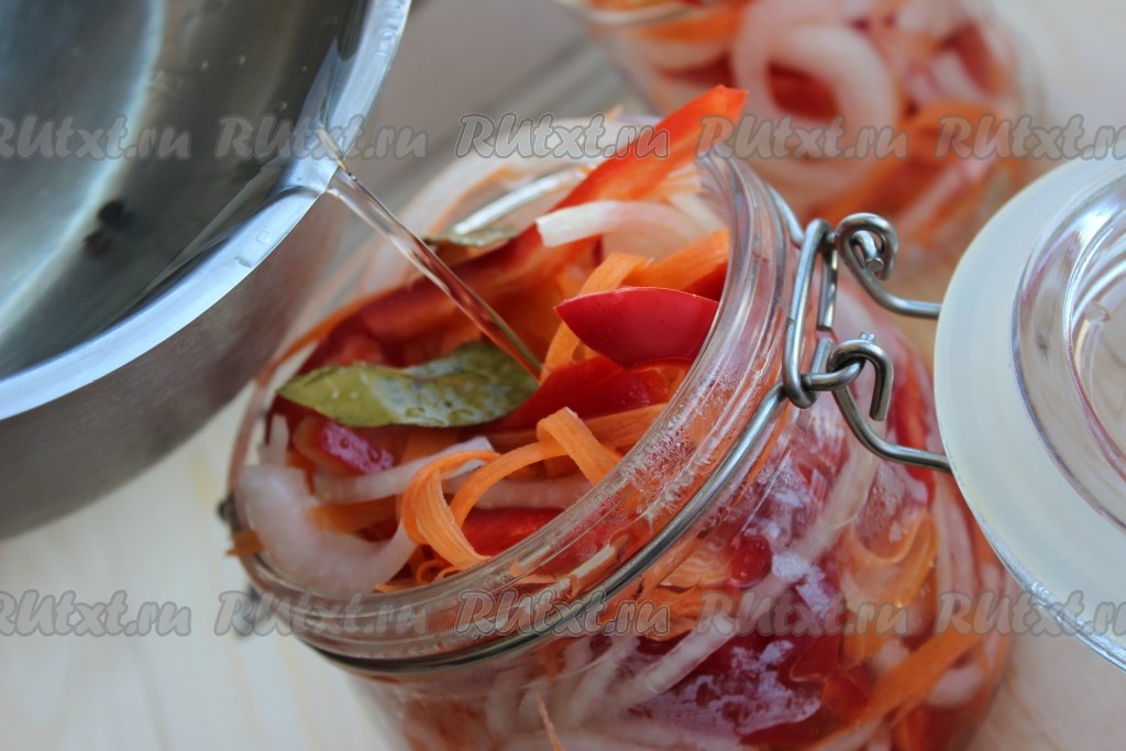 Залить овощи горячим маринадом. Закрыть банку капроновой или винтовой крышкой и оставить до полного остывания при комнатной температуре, затем убрать в холодильник.