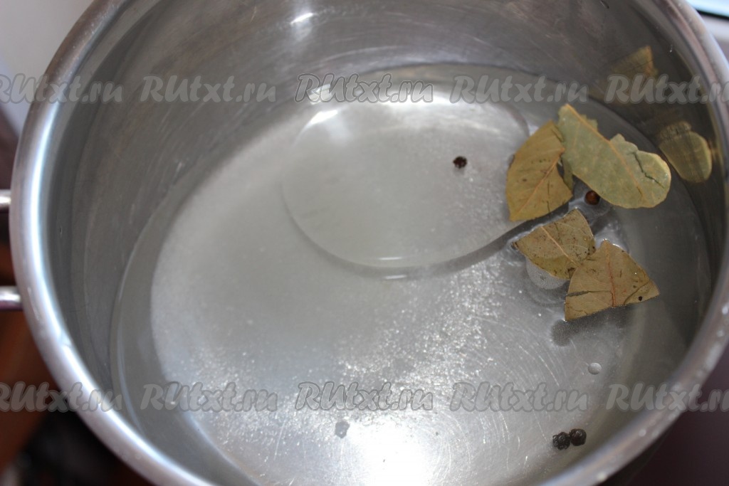 Для приготовления маринада нужно в кастрюлю влить воду, растительное масло, добавить сахар, соль, перец горошком и лавровые листья, поставить на огонь. Довести до кипения и проварить 1-2 минуты на среднем огне. Влить уксус, перемешать и снять с огня.