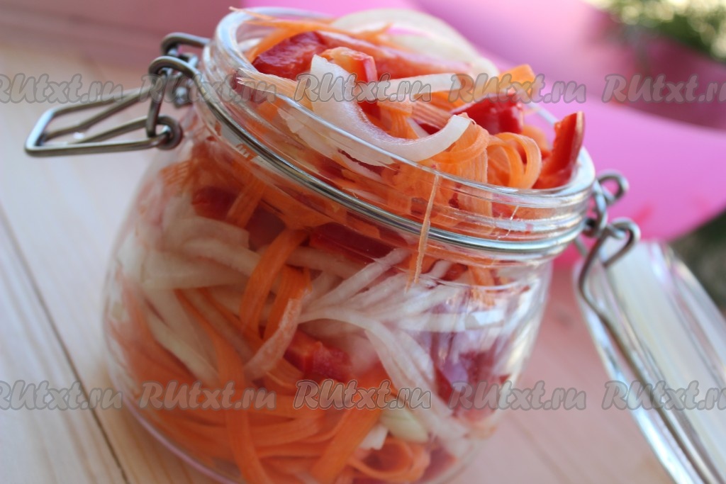 Предлагаю вам рецепт быстрого приготовления наивкуснейшего маринованного болгарского перца. Это блюдо точно понравится тем, кто любит в меру острые закуски. Перец маринуется с добавлением моркови и лука очень быстро и просто, уже через сутки его можно подать к столу в качестве закуски к отварной картошке, мясным или рыбным блюдам. Из данного количества продуктов получается 1 литровая банка вкусного, аппетитного маринованного болгарского перца.
