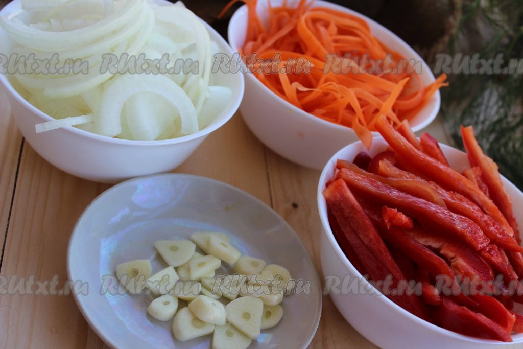 Чеснок, лук, морковь почистить, промыть водой. Чеснок нарезать на тонкие лепестки, лук - на полукольца. Морковь натереть на тёрке для корейской морковки (или нарезать на тоненькие полоски. Болгарский перец помыть, удалить семена и перегородки, нарезать соломкой.