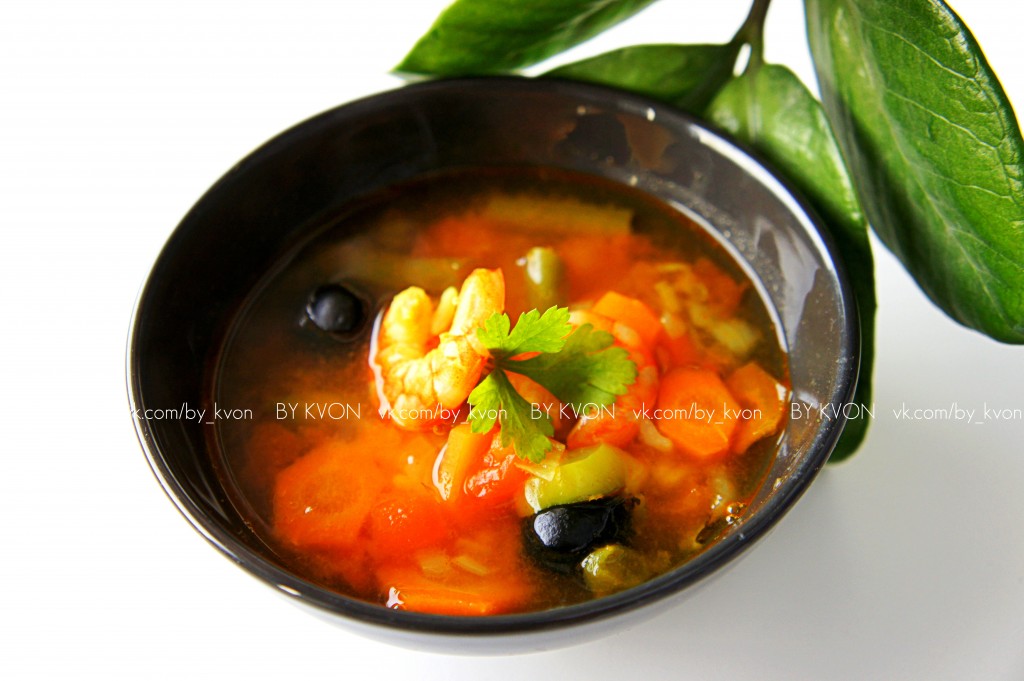 Безумно люблю креветки, хоть на сегодняшний день они уже не являются экзотическим продуктом. Но почему-то до сих пор у меня сохранилось какое-то трепетное чувство по отношению к ним. Любое блюдо с креветками получается довольно торжественным и в тоже время очень романтичным. Креветки люблю добавлять в салаты, готовить на второе блюдо или подавать в качестве закуски, но сегодня хочется предложить вам рецепт супа с креветками и рисом. Блюдо получается сытным и вкусным. Овощи можно подбирать по своему вкусу.
