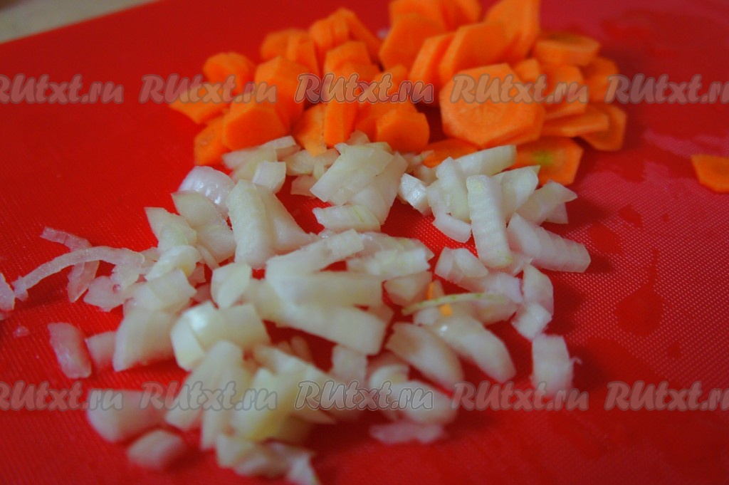 Лук мелко нарезать. Морковь нарезать "кружком".