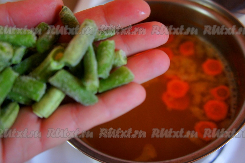 Добавить в бульон стручковую фасоль (у меня замороженная), перемешать, варить 3 минуты.